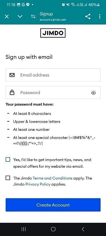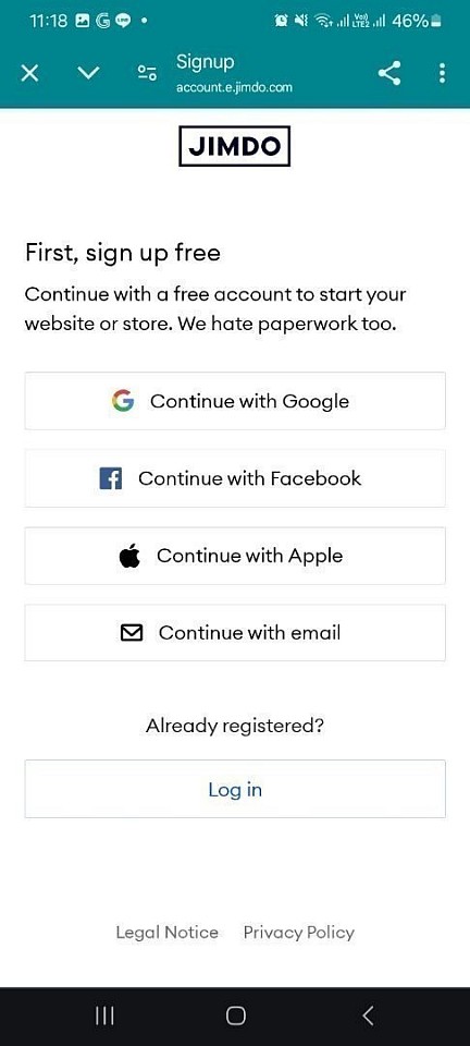 Sobald du die Jimdo App heruntergeladen hast, kannst du ganz einfach loslegen. Du kannst dich mit deinen Google-, Facebook- oder Apple-Anmeldedaten anmelden oder dich registrieren und mit deiner E-Mail-Adresse bestätigen.
