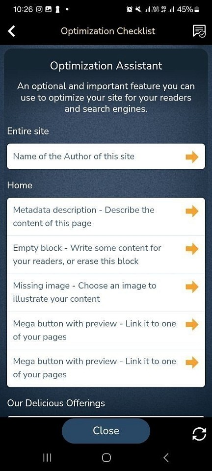- El Asistente de Optimización proporciona una lista detallada para ayudarte a optimizar tu sitio web