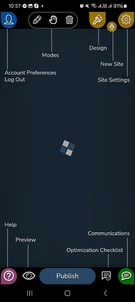 El editor es compatible con dispositivos móviles, con los menús principales claramente visibles en el encabezado y el pie de página. En la parte superior central, encontrará los tres modos principales del editor: