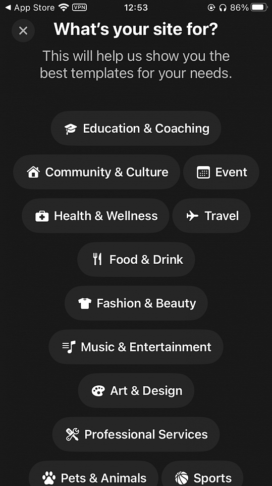 La première fois qu'on lance l'app, on est bien accompagné pour la configuration initiale. Quand on s'inscrit par exemple, il y a un petit questionnaire sur l'objectif du site que l'on entend faire et sur le secteur d'activité dans lequel on travaille. On peut ensuite créer son site, soit à partir d'un modèle déjà prérempli, sans à partir d'un site vide.