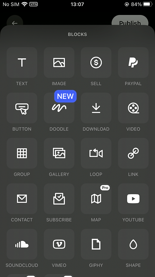 L'app Universe propose tous les outils essentiels à la création de sites web : texte, images, boutons, vidéos, e-commerce, etc. Ces éléments sont accessibles via le menu "Blocs" situé en bas de l'écran.