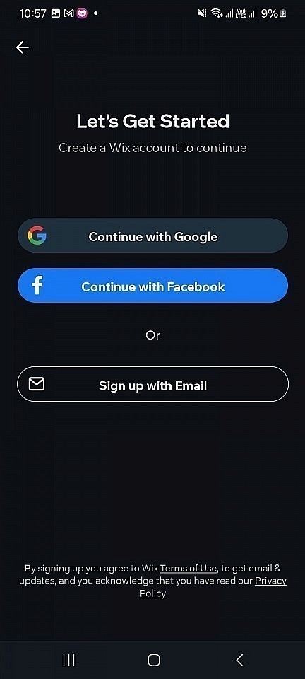 Après avoir téléchargé et installé l'app Wix, on est accueilli par un bel écran qui nous invite à nous connecter ou à "Commencer" (si on n'a pas encore de compte Wix).