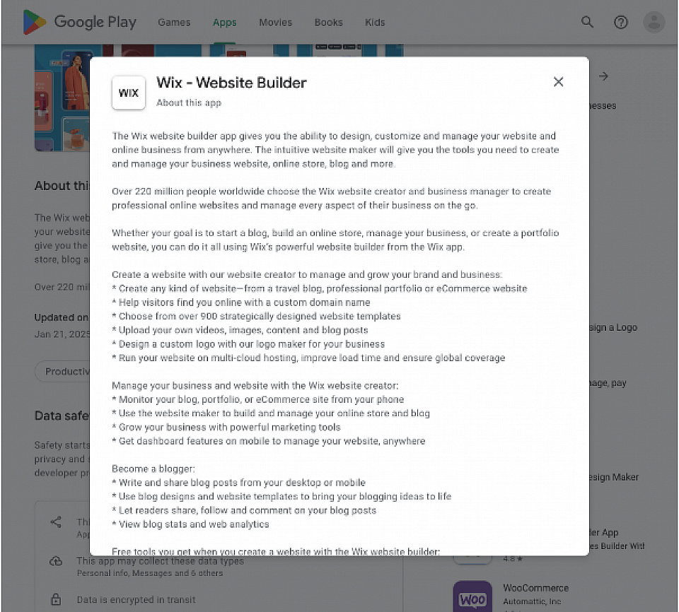 Jetons un coup d’œil à la description de l’app Wix dans Google Play :
